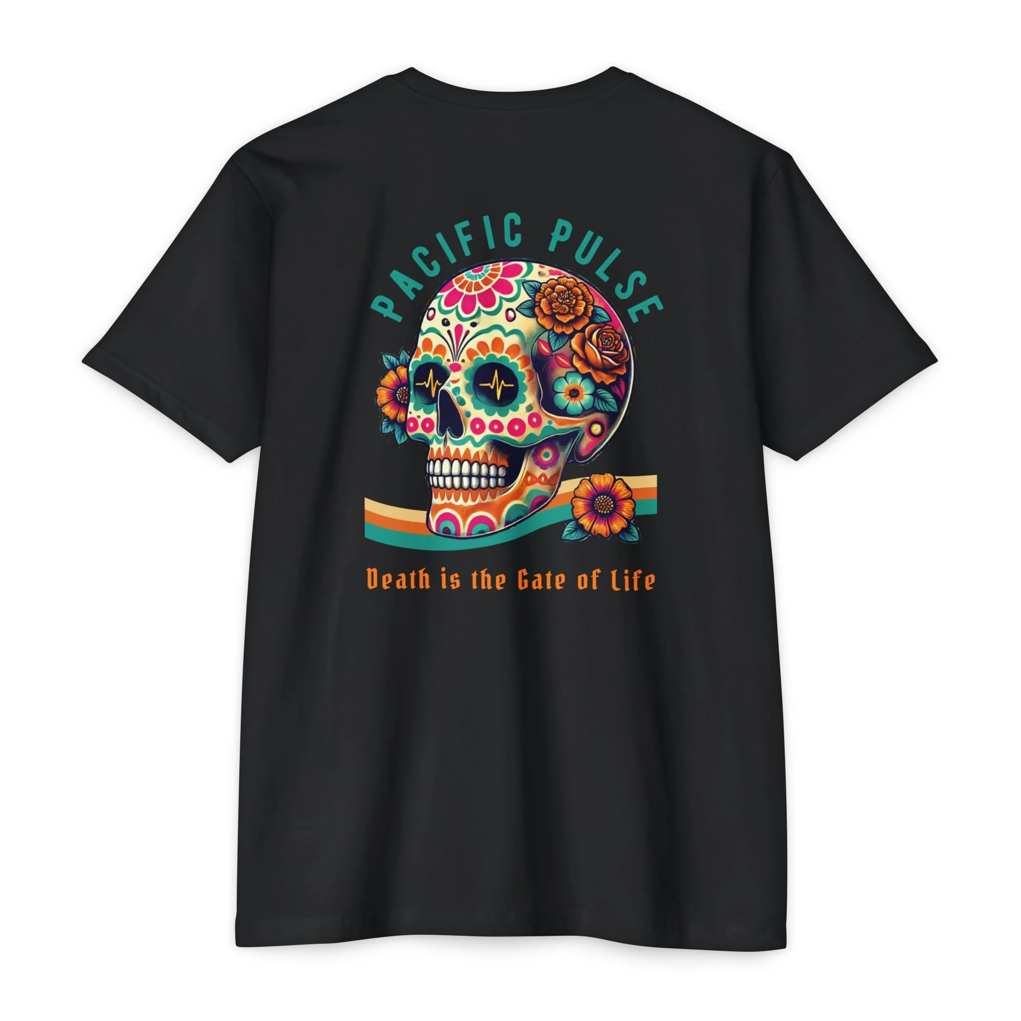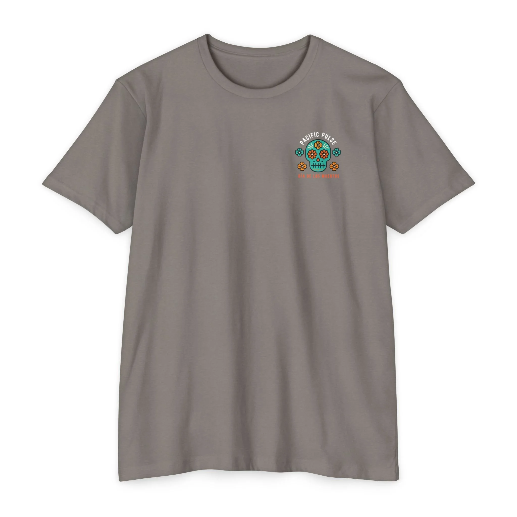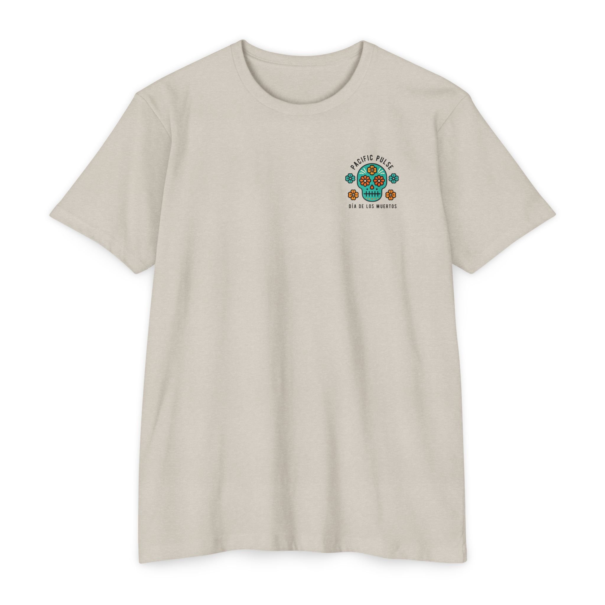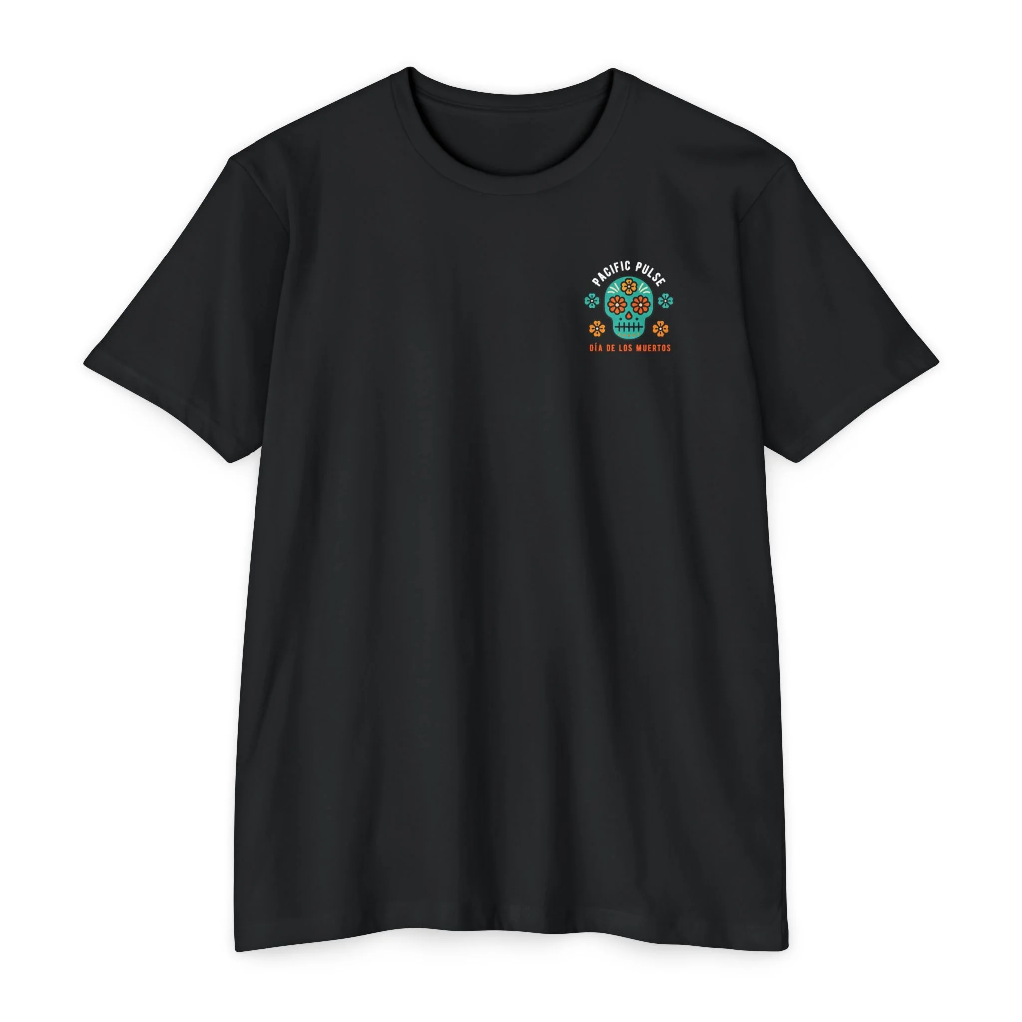 This isn't just a shirt—it’s a mindset. Featuring a vivid sugar skull framed by marigolds and a retro Pacific rainbow, this design honors Día de los Muertos while reminding us that every ending fuels a powerful new beginning.