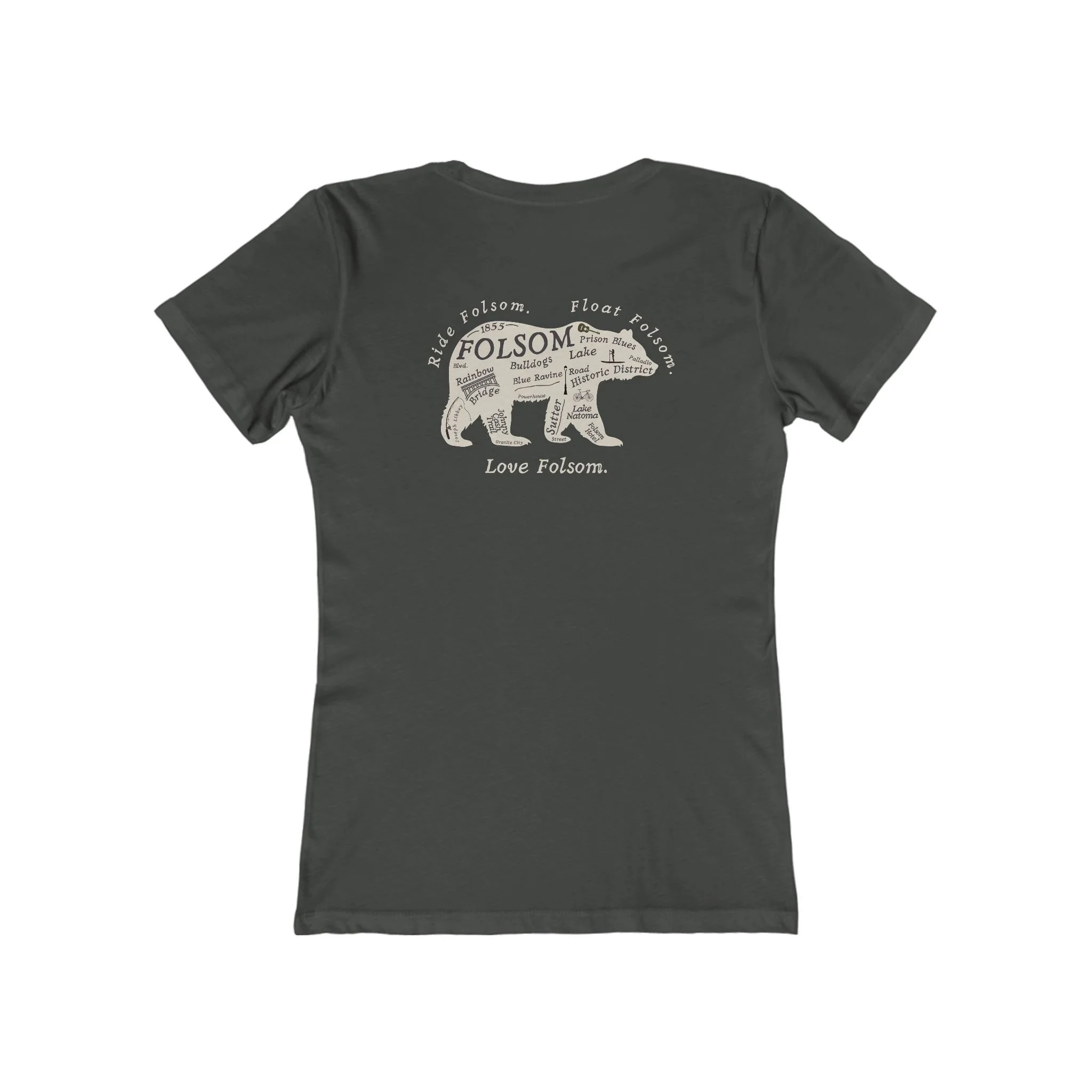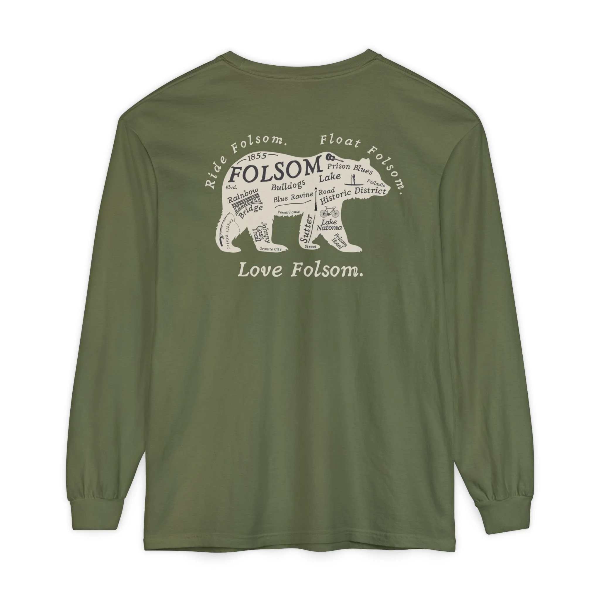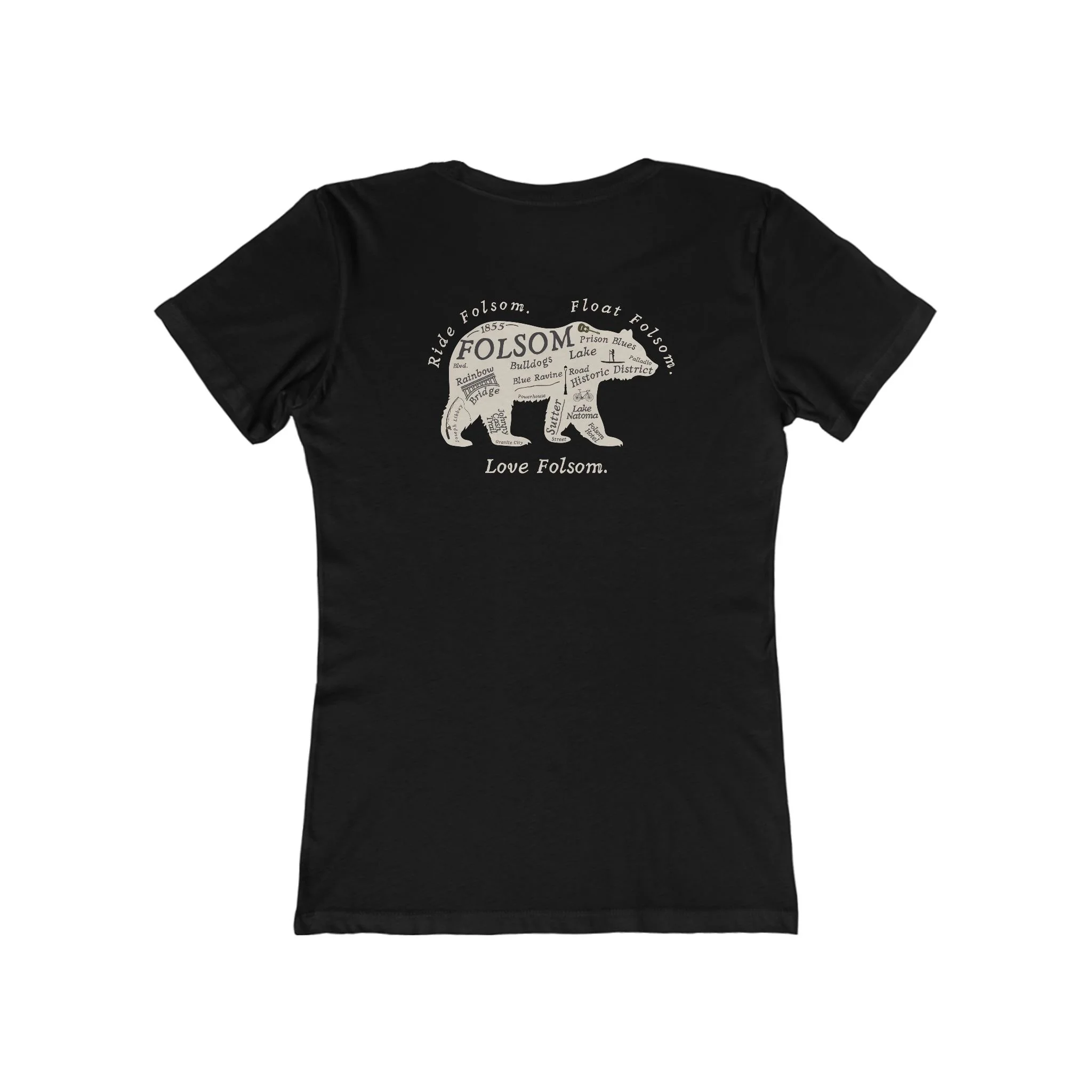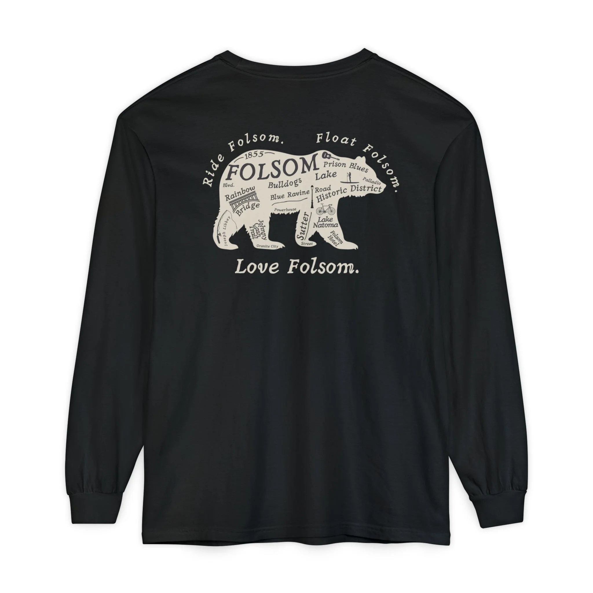 The Love Folsom Bear is a tribute to where it all began. Featuring a custom California bear design filled with local landmarks—from Sutter Street to Lake Natoma, Rainbow Bridge to the Folsom Bulldogs—this tee is a hometown map you can wear with pride.