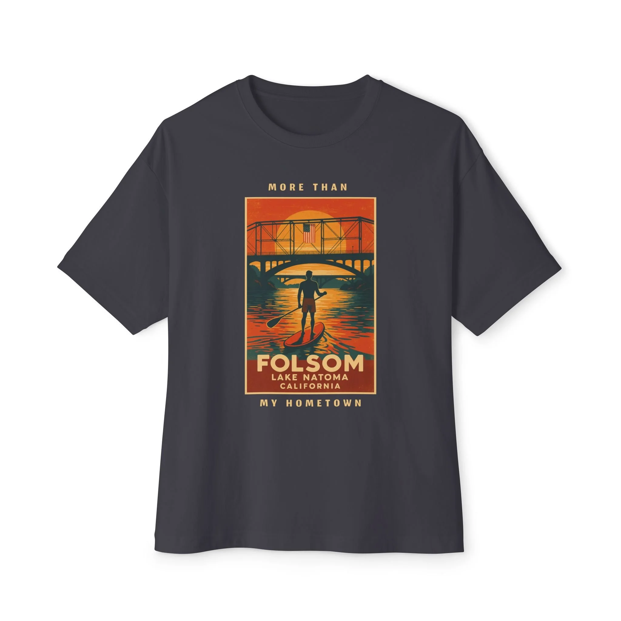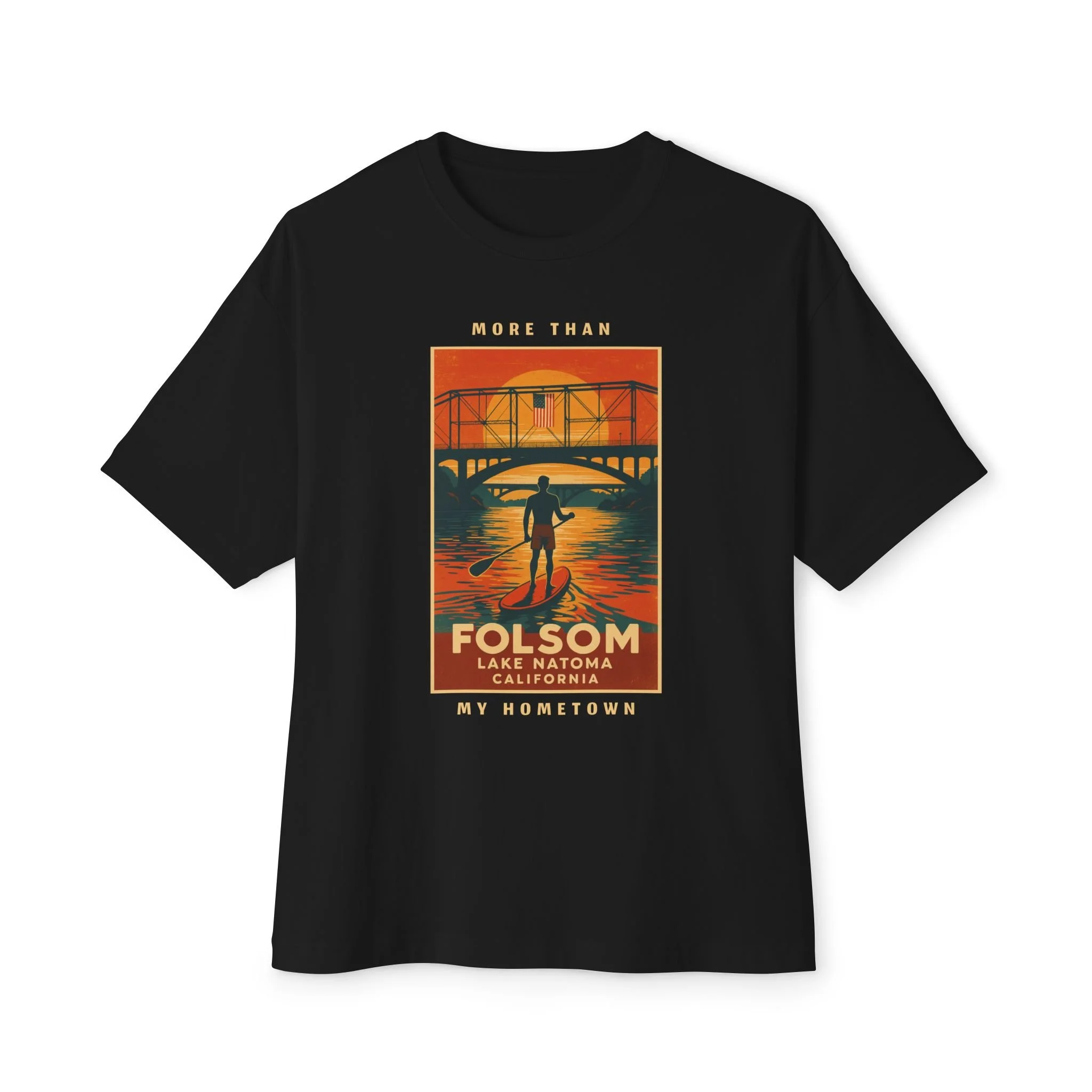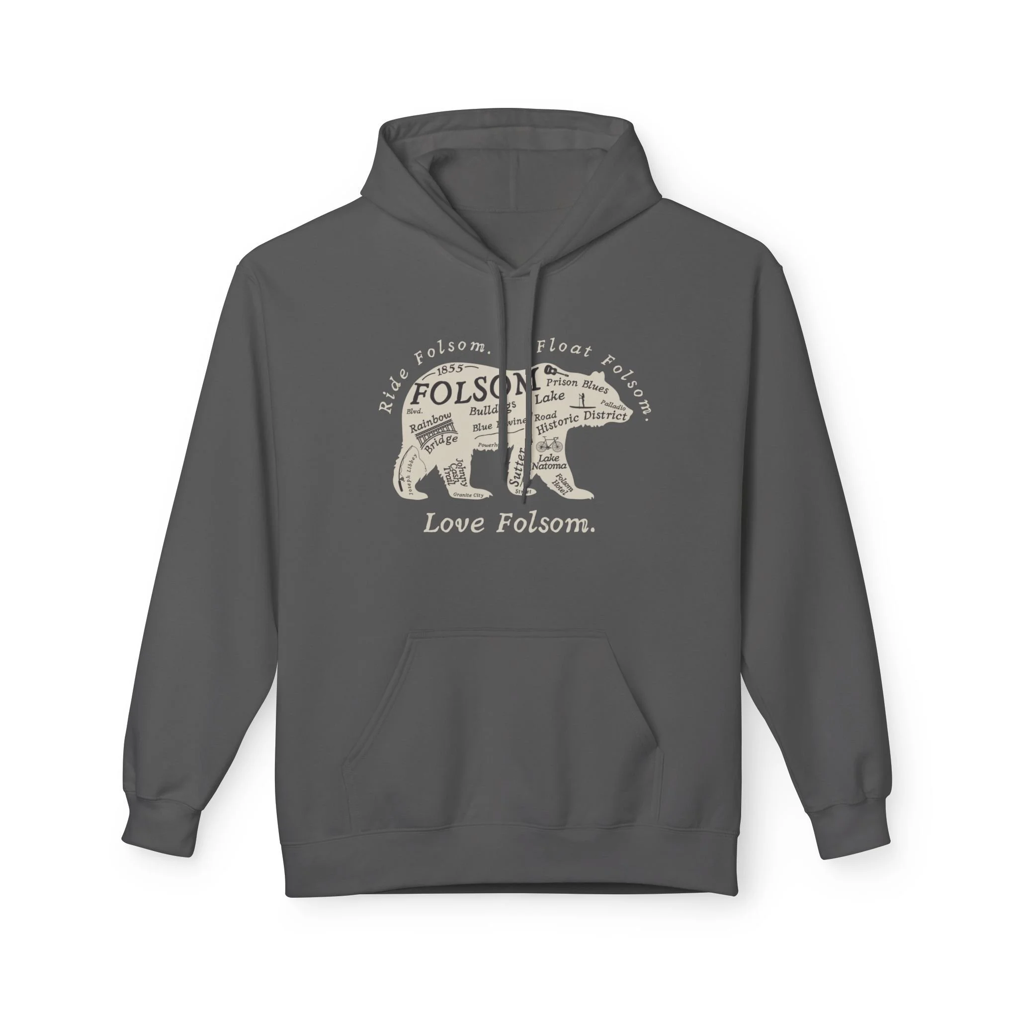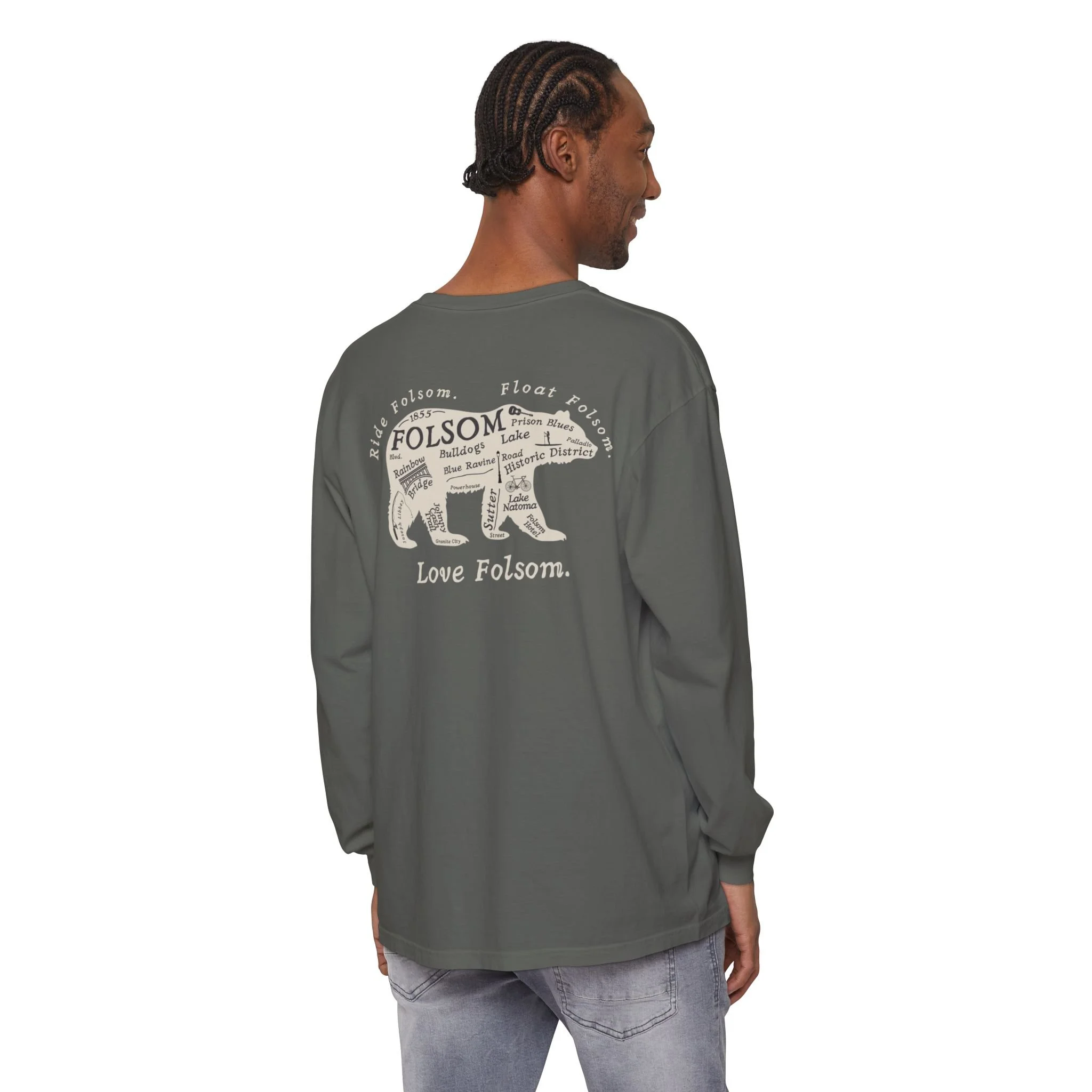 The Love Folsom Bear is a tribute to where it all began. Featuring a custom California bear design filled with local landmarks—from Sutter Street to Lake Natoma, Rainbow Bridge to the Folsom Bulldogs—this tee is a hometown map you can wear with pride.